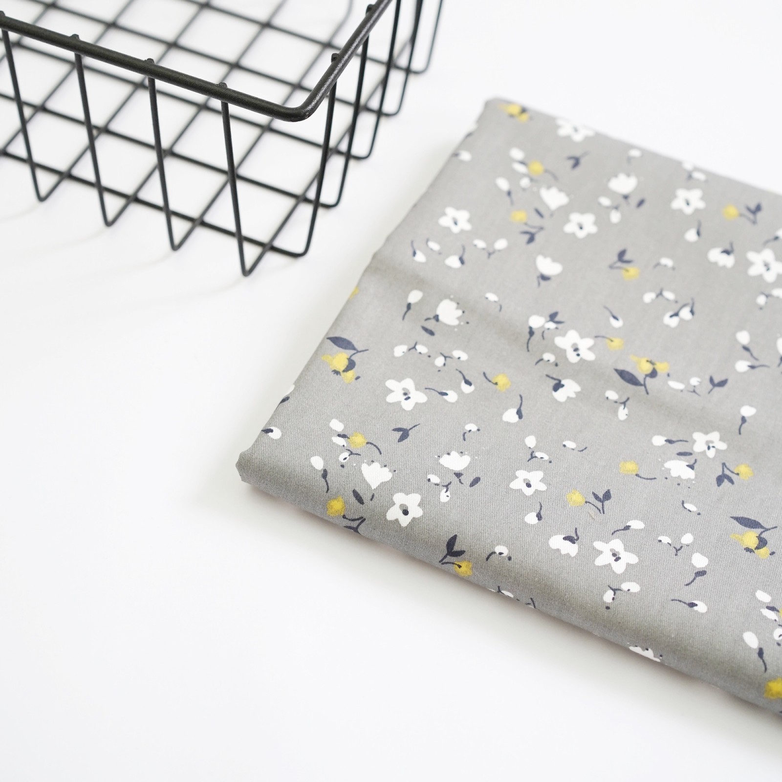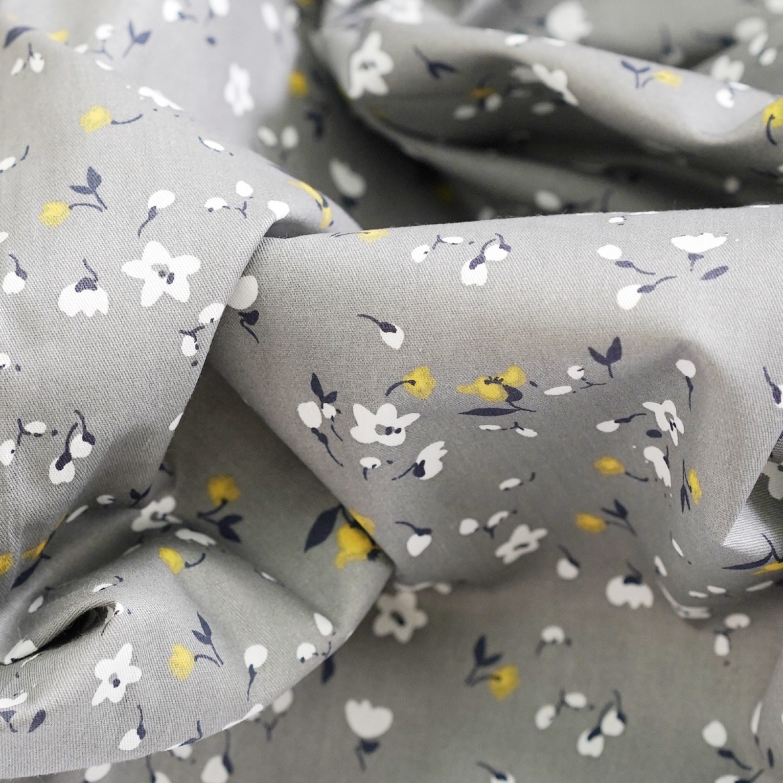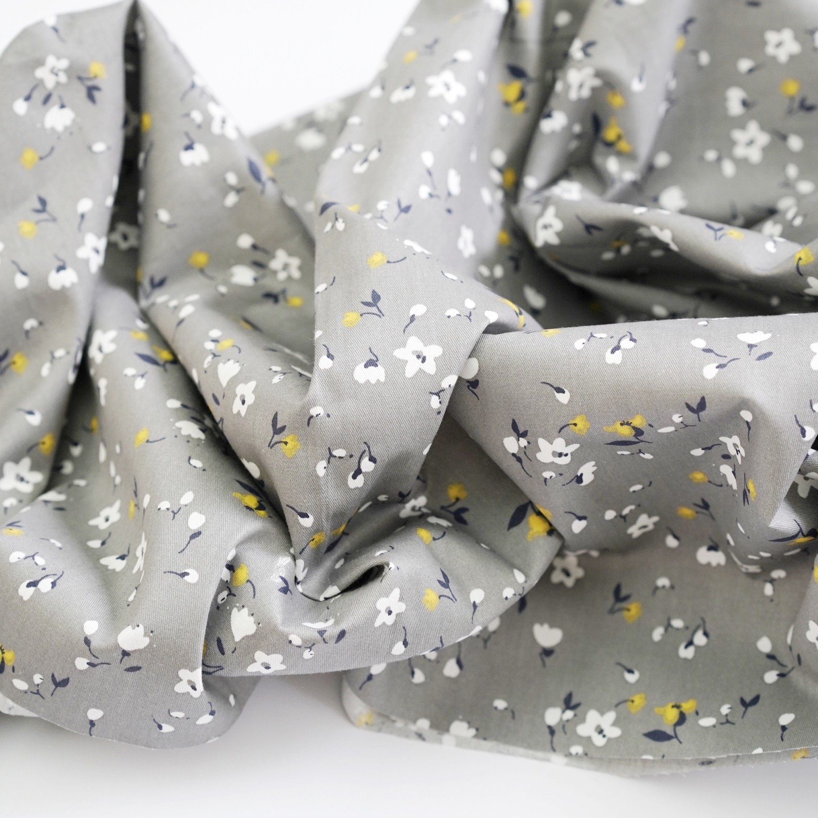 Сатин. Цвет белые и горчичные цветы на сером