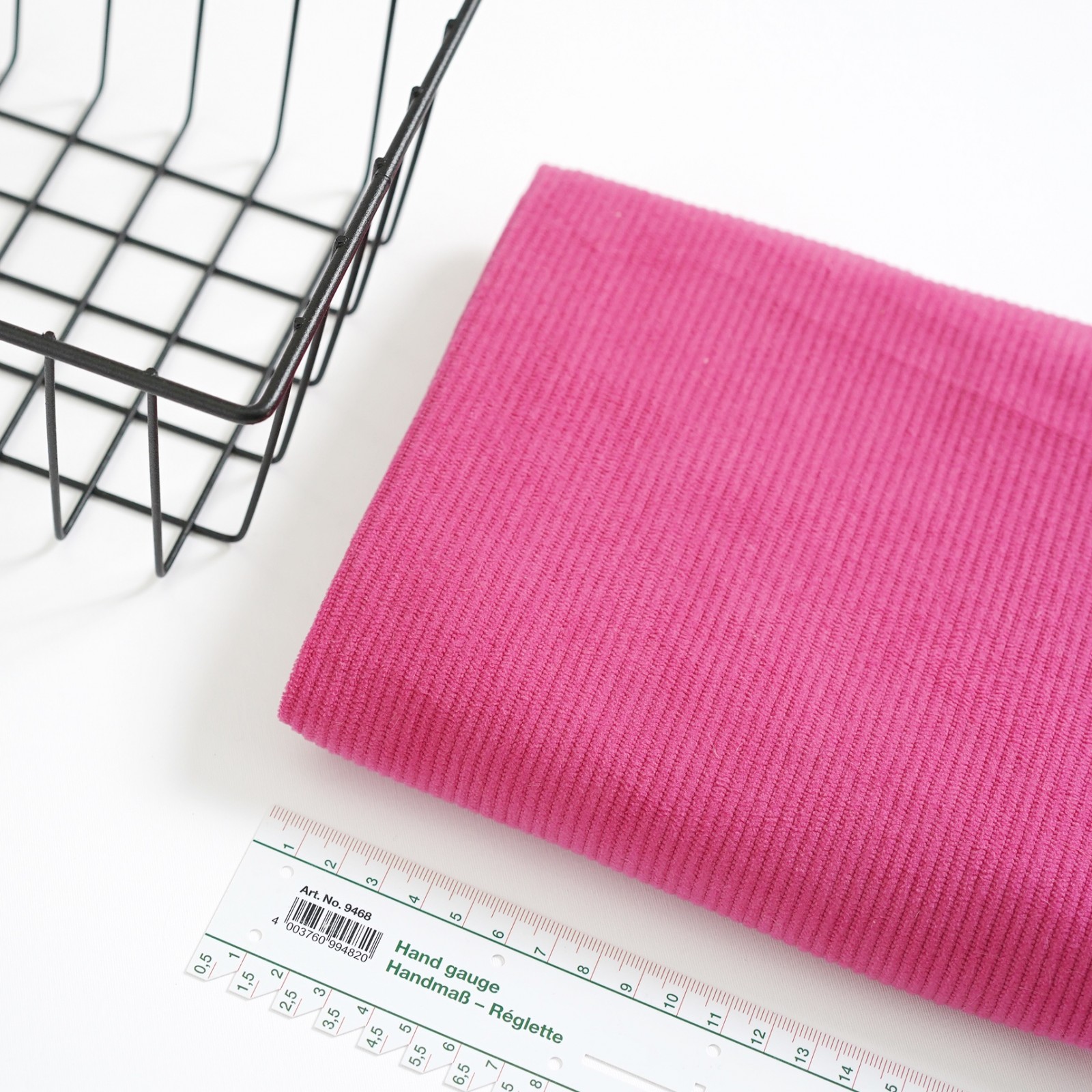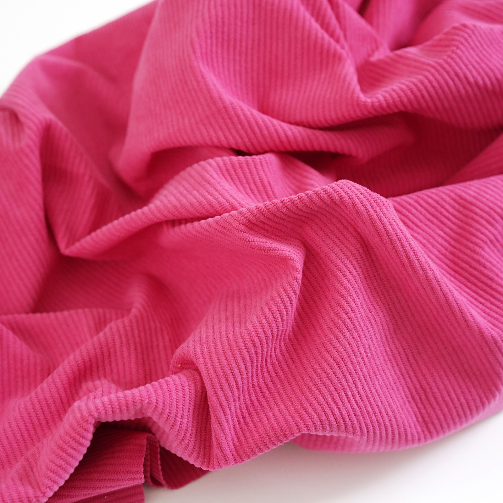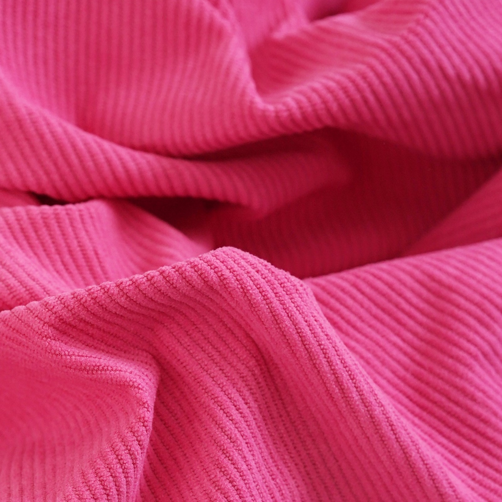 Вельвет трикотажный - это мягкая и плюшевая ткань, выполненная с использованием специальной технологии, при которой короткие ворсинки плотно располагаются на поверхности материала, создавая бархатистый эффект в рубчик. Ширина рубчика около 2 мм