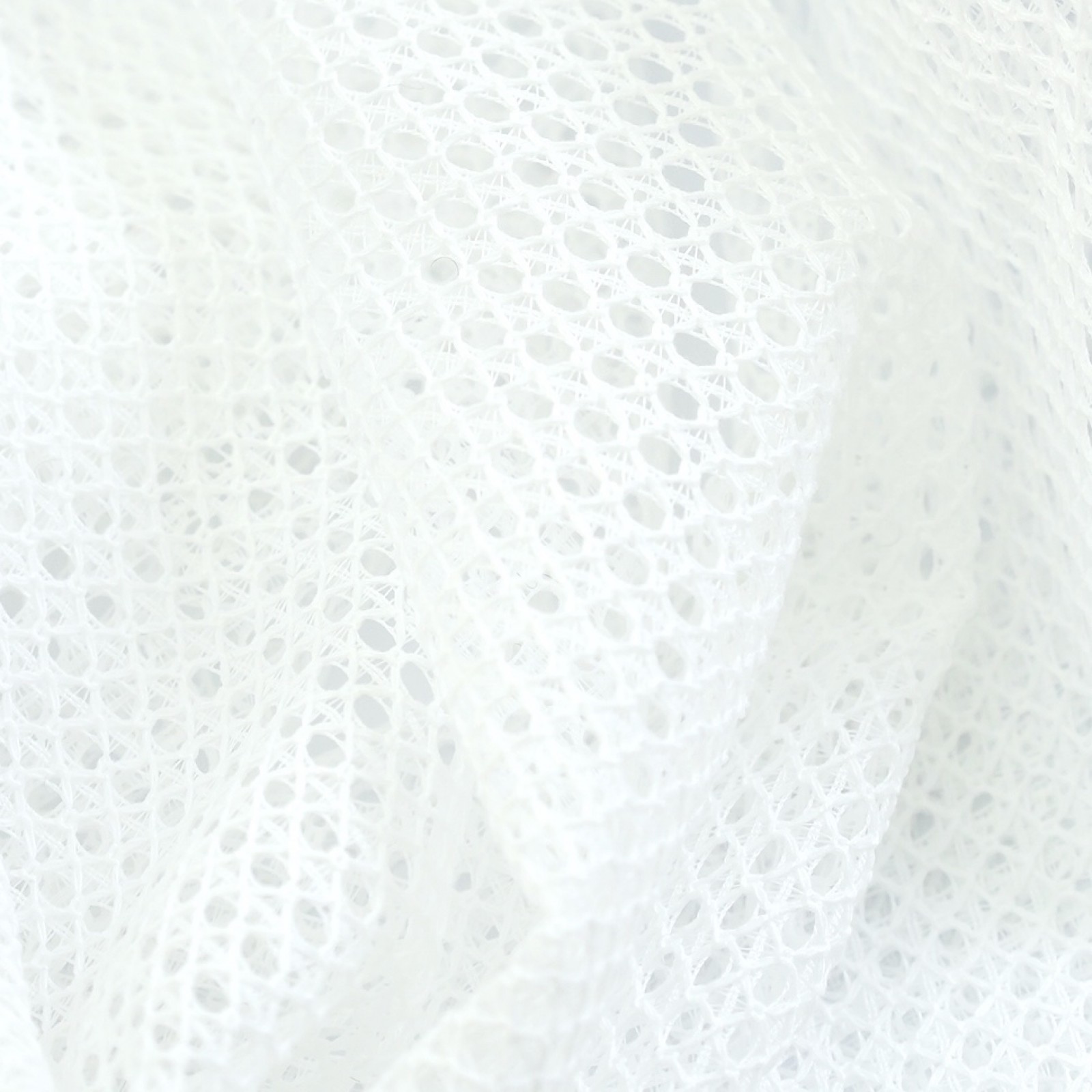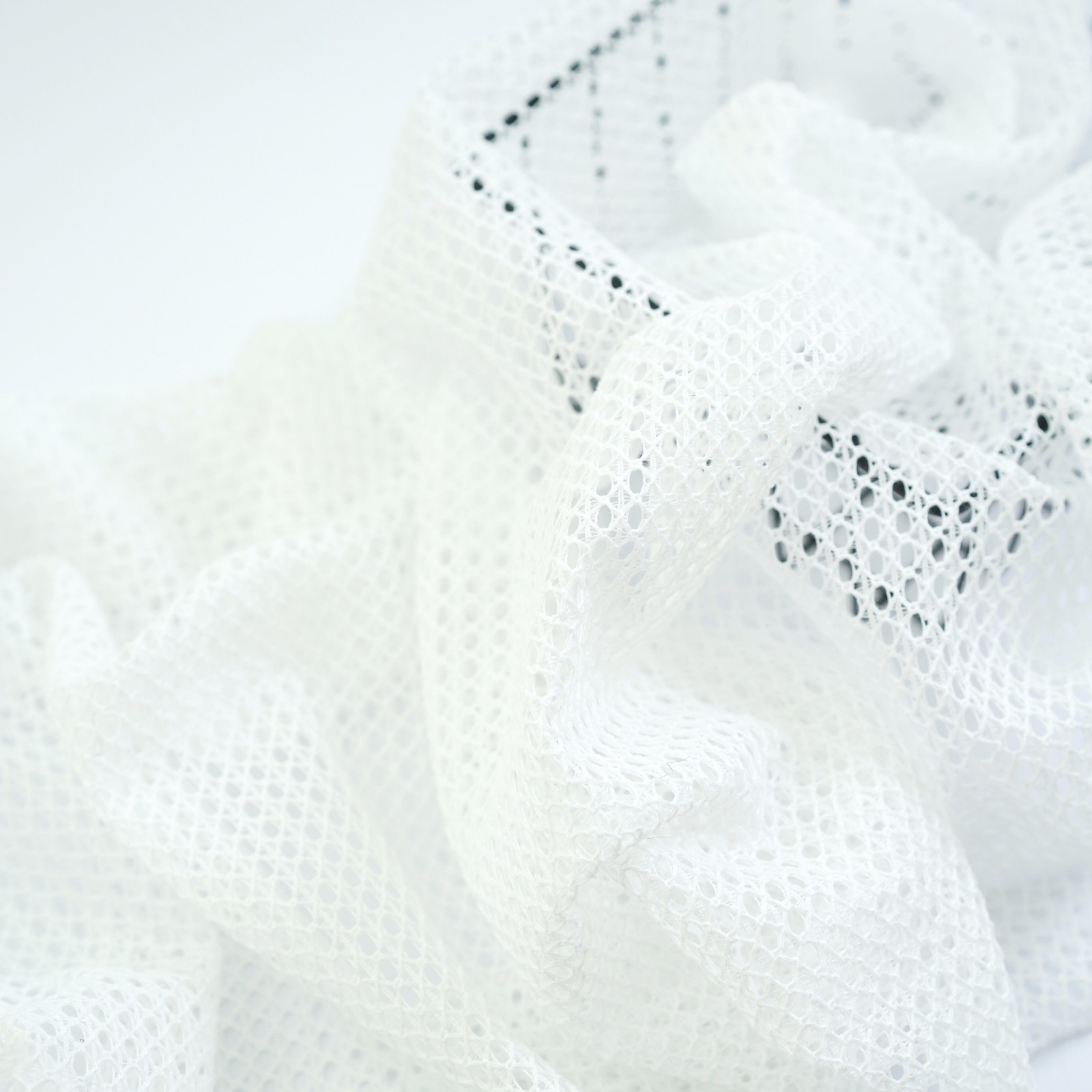 Ажурное сетчатое полотно. Материал легкий и просвечивающий, за счет неплотного плетения. Сочетание полиэстера и хлопка позволяет создать ткань, обладающую исключительной воздушностью и комфортом. Хлопковые волокна дарят ажурному трикотажу невероятную мягкость и приятную на ощупь текстуру, в то время как полиэстер обеспечивает превосходную износостойкость и сохранение формы. Синтетические волокна не позволяет полотну мяться. Поверхность представляет собой плотные, рельефные кружевные элементы, соединенные сетчатыми "связками". Изнаночная сторона менее рельефная, чем лицевая.