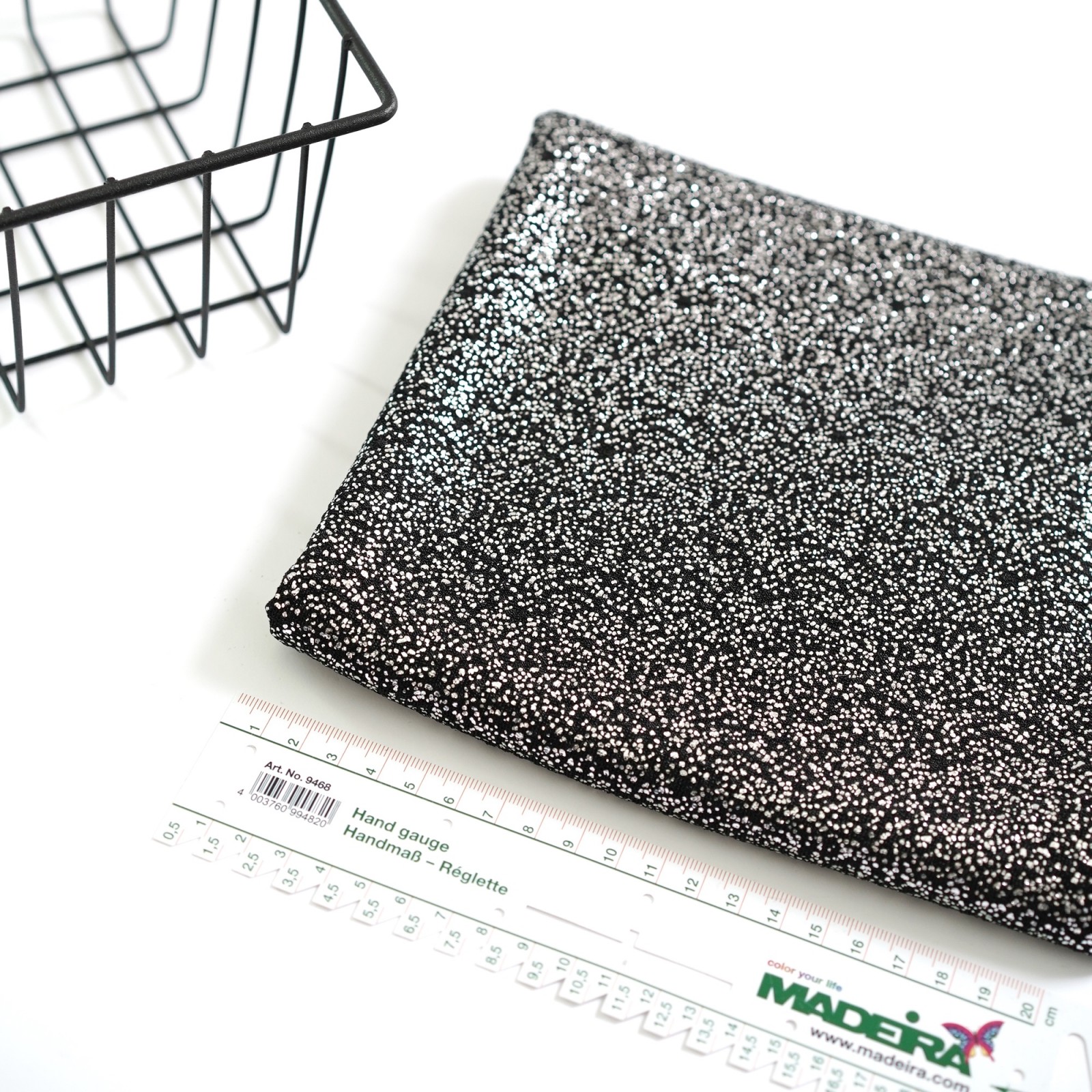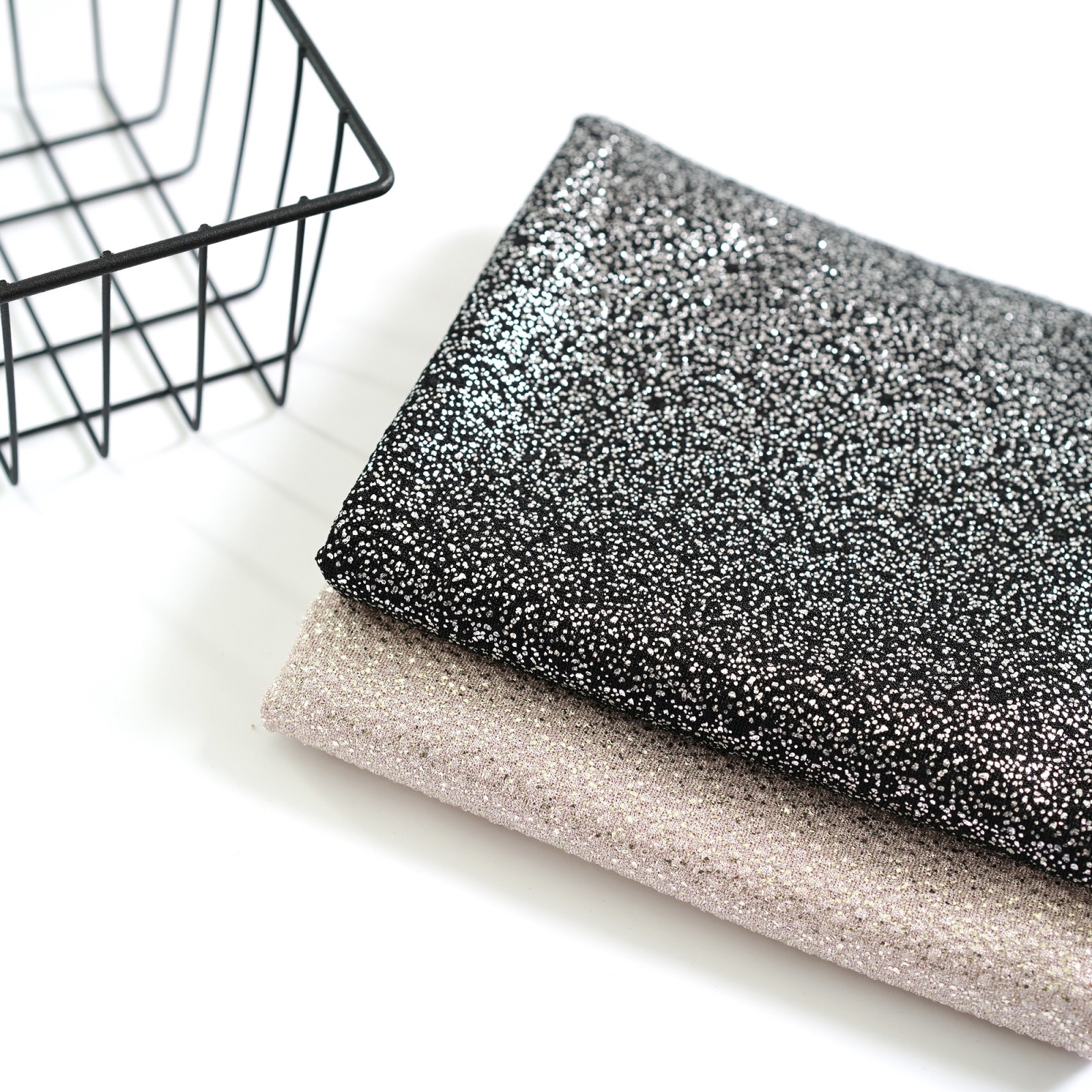 Лицевая сторона ткани отличается рельефной за счет плетения поверхностью, на которую нанесено специальное блестящее напыление. Благодаря этому эффекту, трикотаж приобретает эффектный, сияющий вид, привлекающий внимание и добавляющий особую выразительность изделиям. Изнаночная сторона ткани имеет матовую, ровную и мягкую поверхностью. Инновационный состав материала, включающий в себя полиэстер и спандекс, обеспечивает ему высокую прочность, эластичность и износостойкость.
