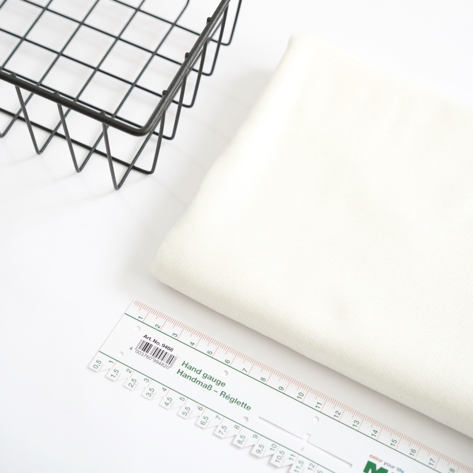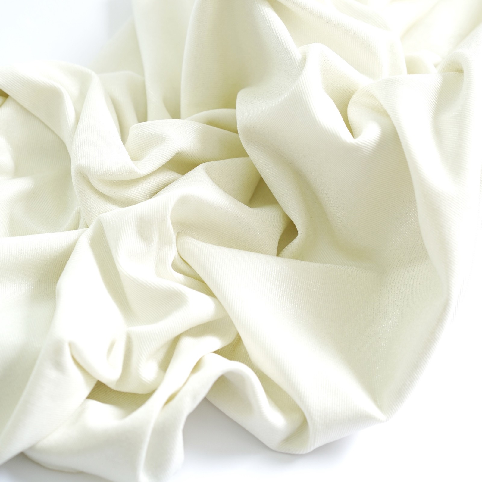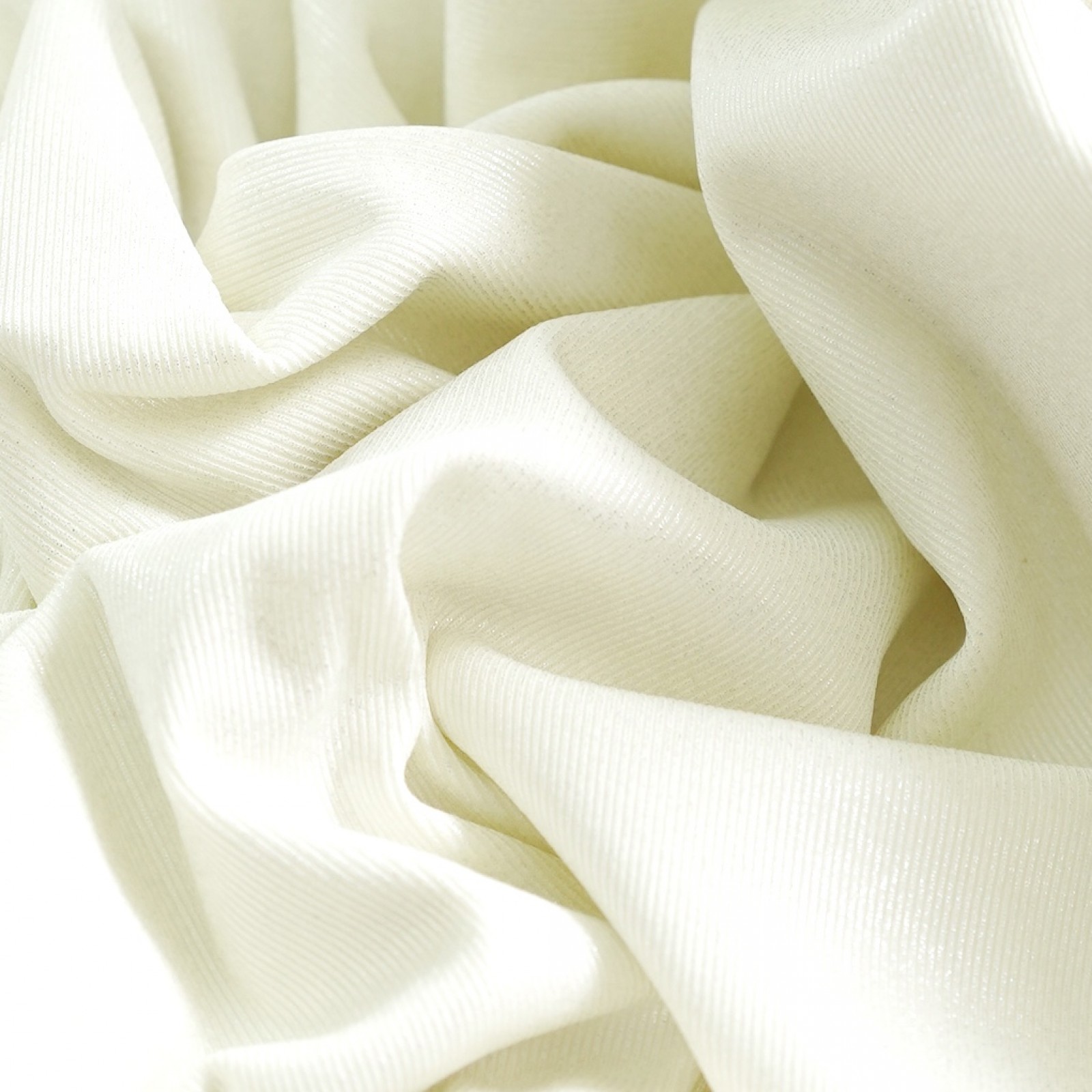 Плотное, но легкое хорошо растяжимое трикотажное полотно. Размер плетения 0.1 см. Лицевая сторона мелкорельефная с деликатным напылением серебристого оттенка, изнаночная сторона - гладкая, мягкая приятная к телу. Главным достоинством ткани является эластичность, при этом после носки она приобретает исходную форму.