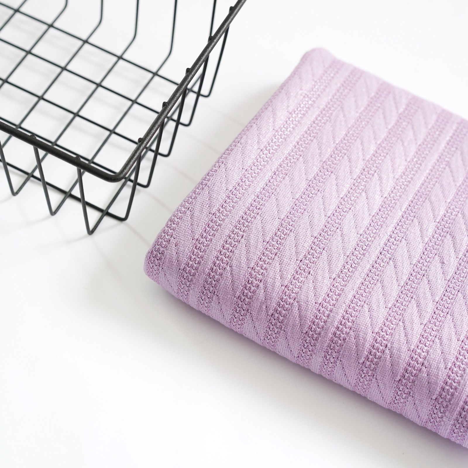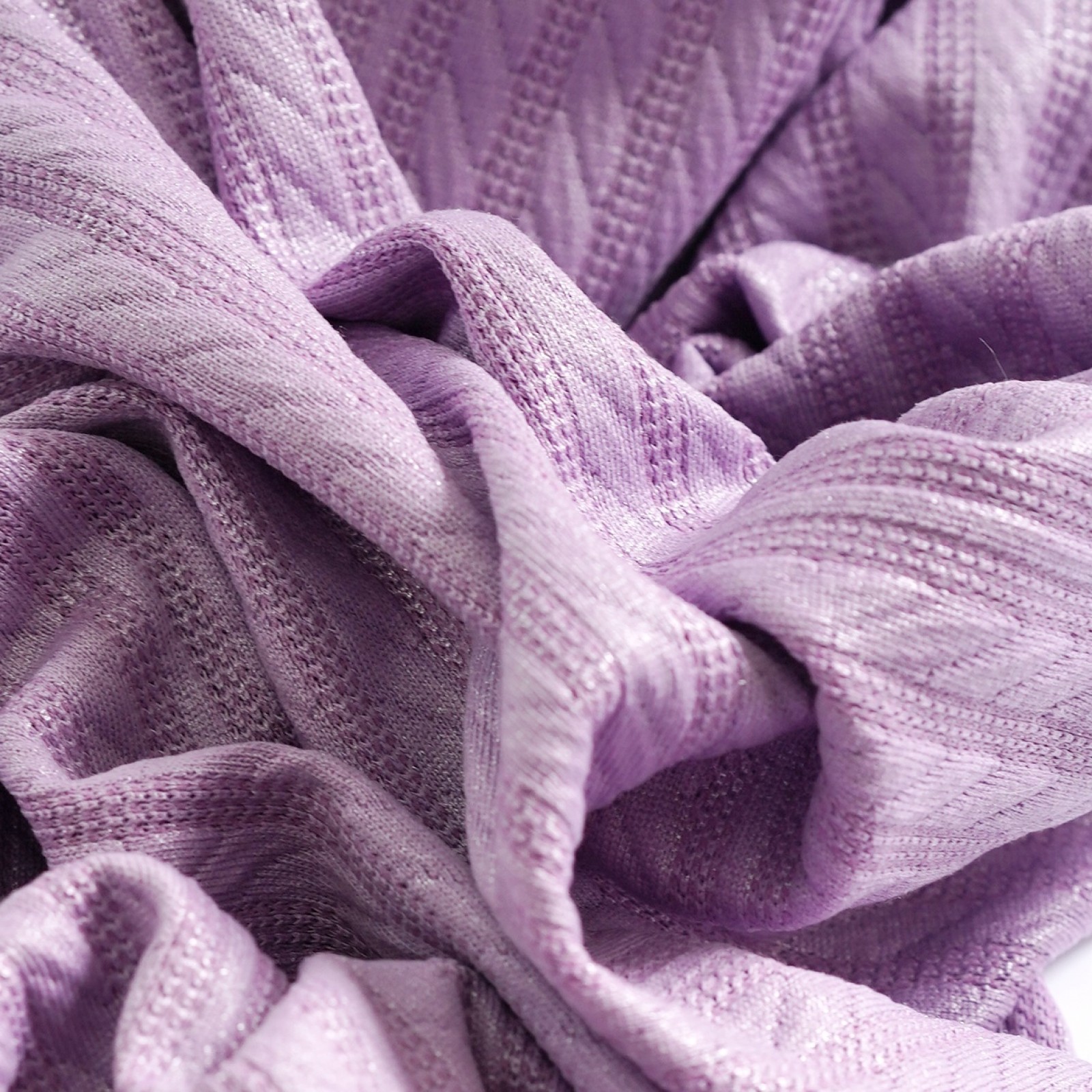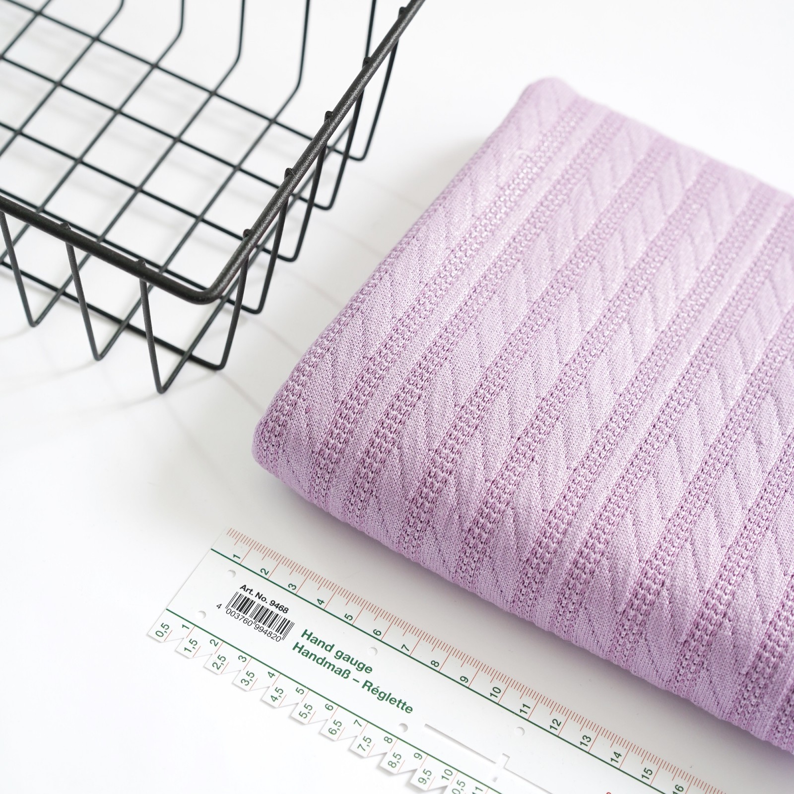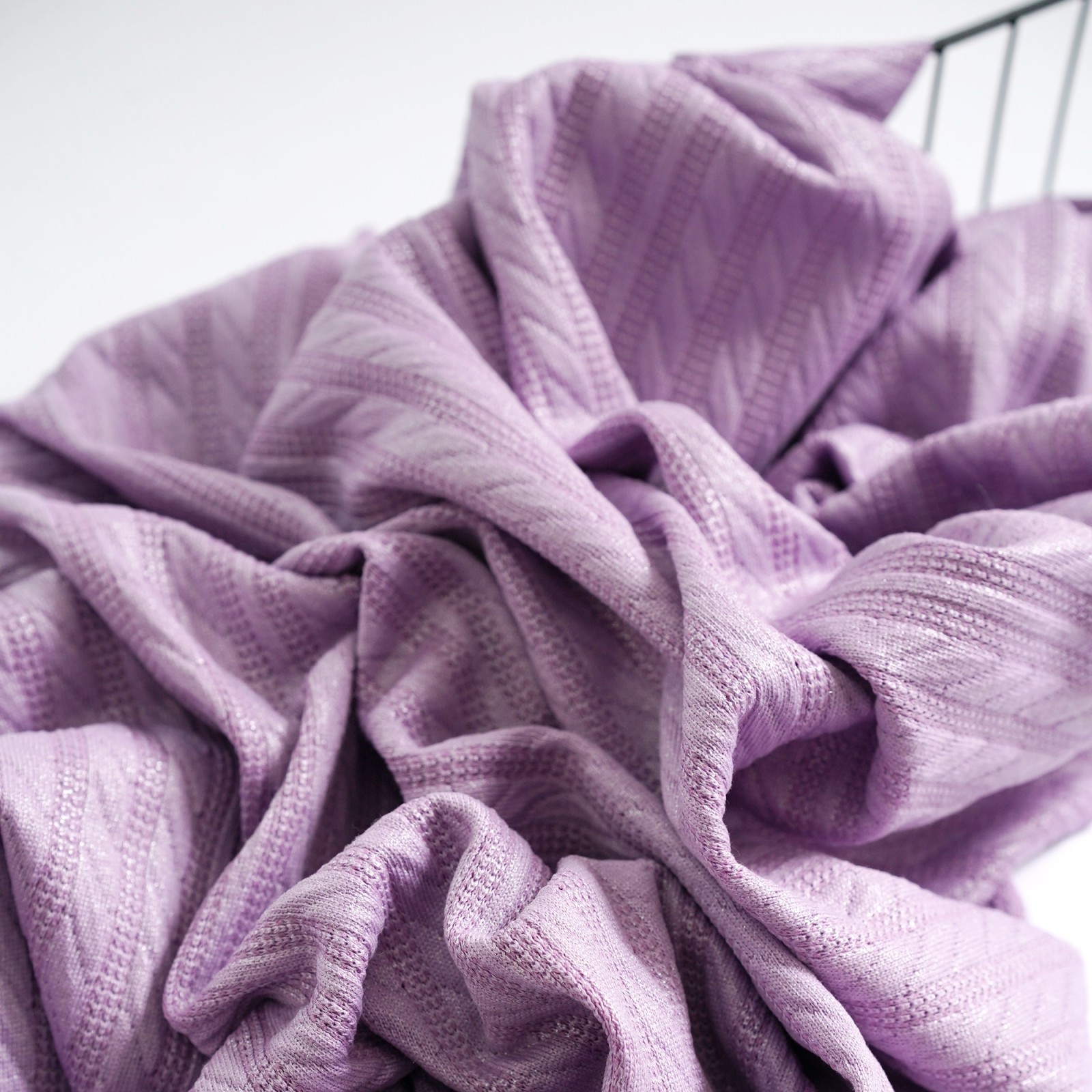 Мягкое, рельефное вязаное полотно средней плотности с деликатной переливающейся отделкой напыления. По всему полотну расположен объёмный плетеный узор. Материал эластичен, имеет растяжимость во всех направлениях.
